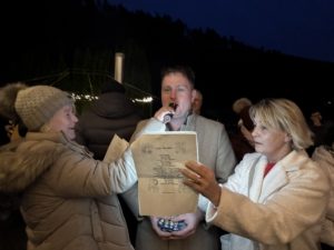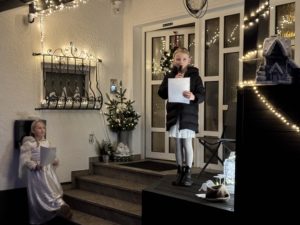 Im Anschluss versammelten sich alle vor dem 6. Adventsfenster am DGH. Marlies Reif las passend zum gestalteten Advents-Fenster die Geschichte „Einer der Geringsten“ vor. Diese Geschichte gab Impulse zu adventlichen Themen wie Verständnis, Mitmenschlichkeit, Nächstenliebe, die aber immer gelten sollten, nicht nur in der Advents- und Weihnachtszeit.