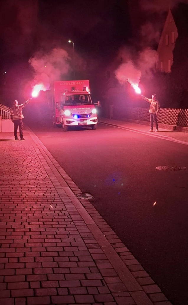 Mit Glockenläuten, Leuchtfackeln , Sirene und TATÜTATAAA hießen wir gegen 20 Uhr das neue Fahrzeug willkommen.